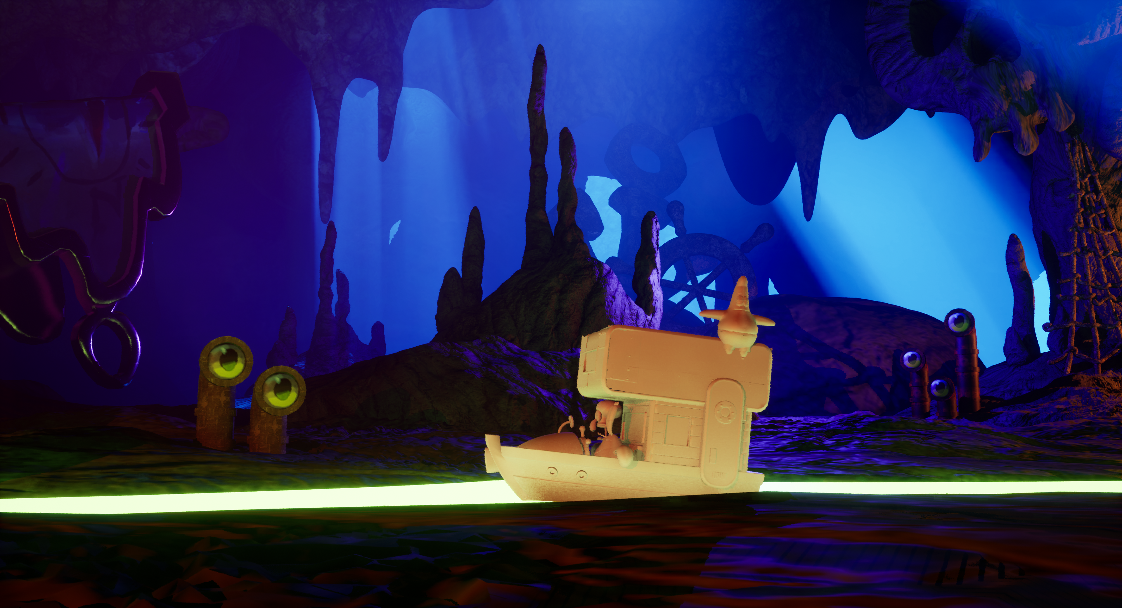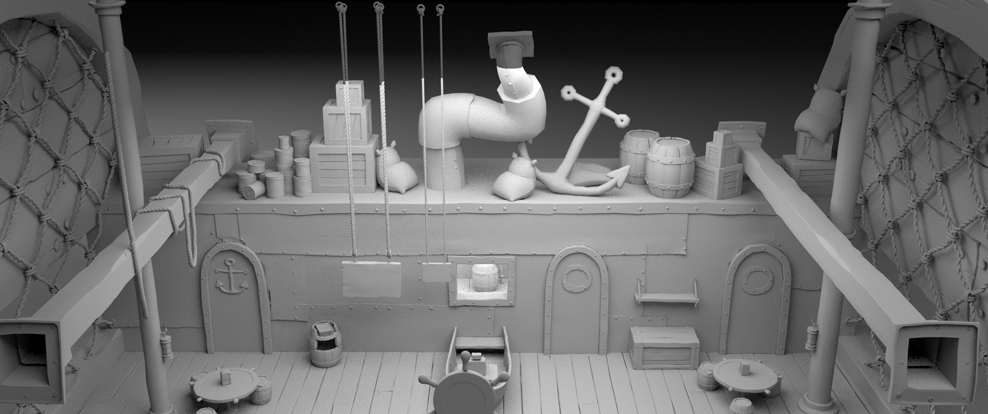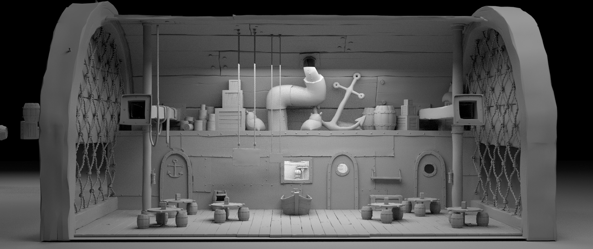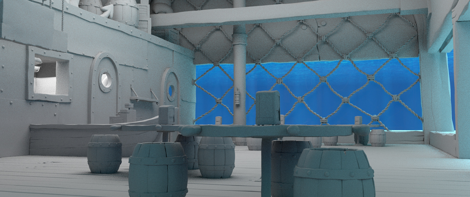 One of my earliest assignments on the project was taking a model from a previous SpongeBob production of the Krusty Krab interior and matching it more closely to season two or three Krusty Krab interior designs from the 2-D series.