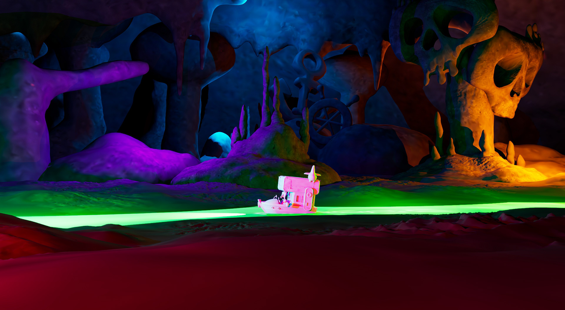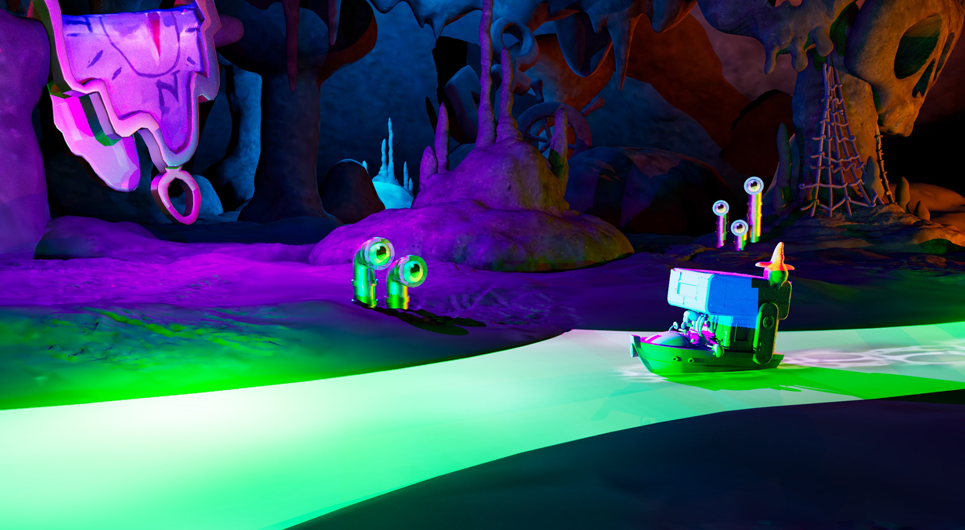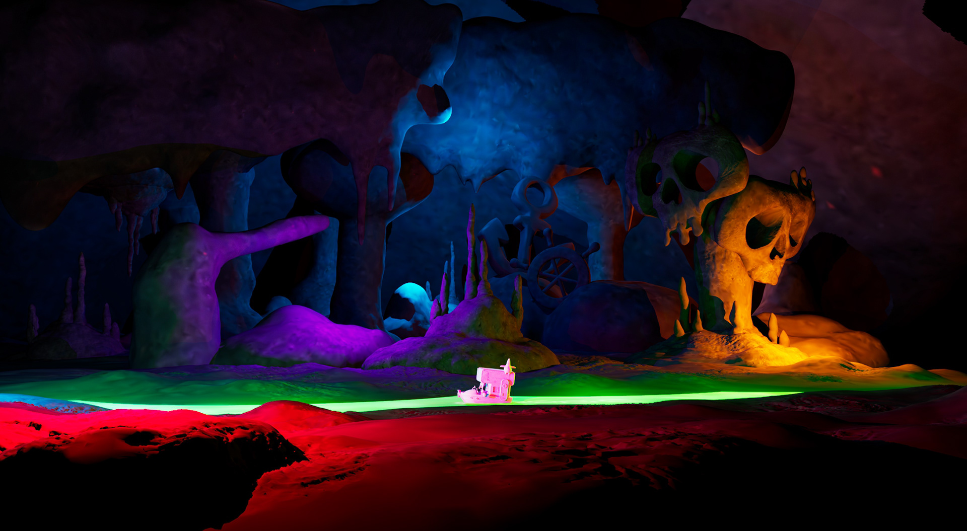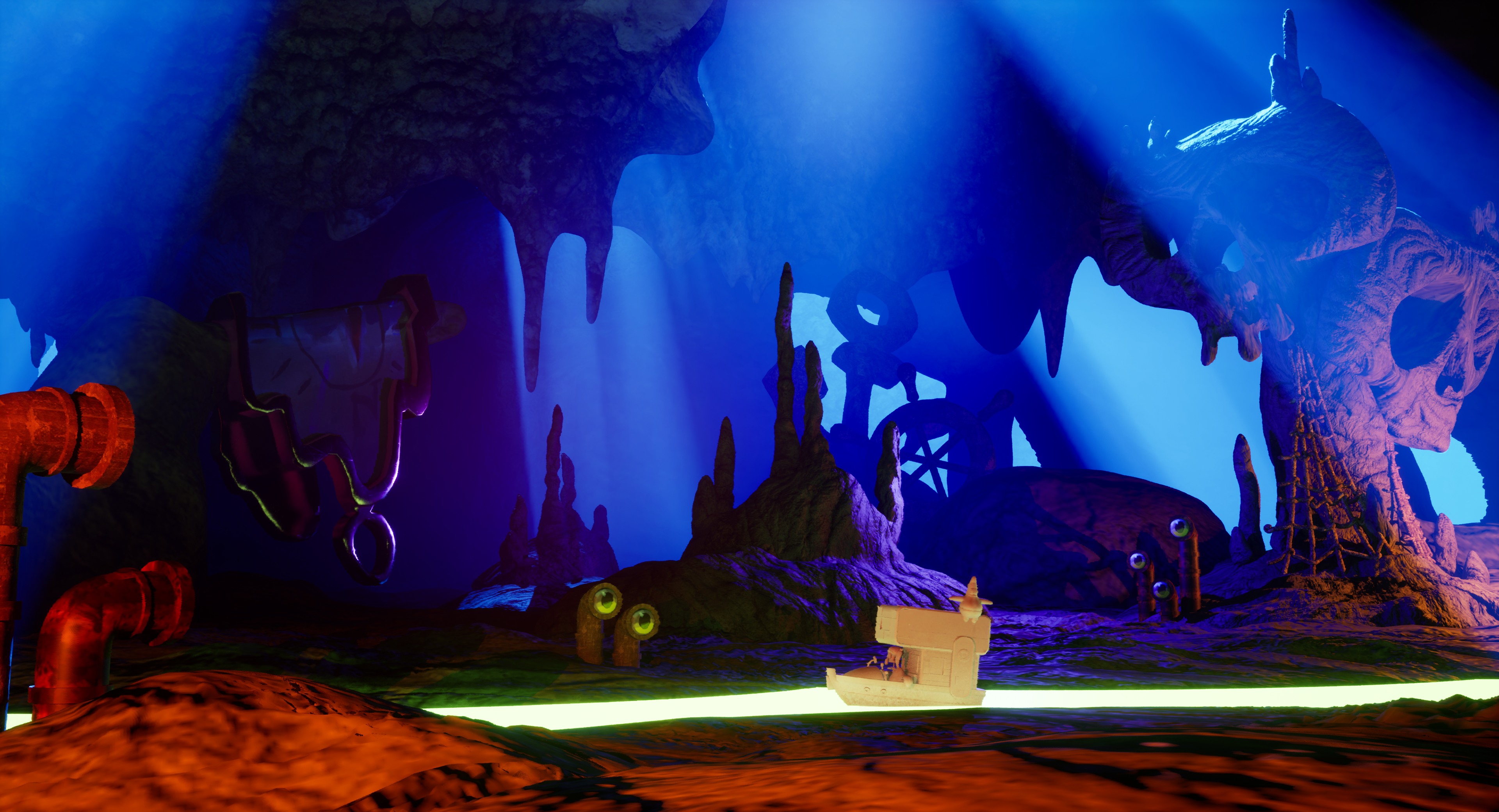 Another early test environment/diorama of an Underworld scene I did to roughly explore the space/colors in 3D based on a painting by @alviramirez_art (last slide) before any 3D environments/sets were officially done etc.